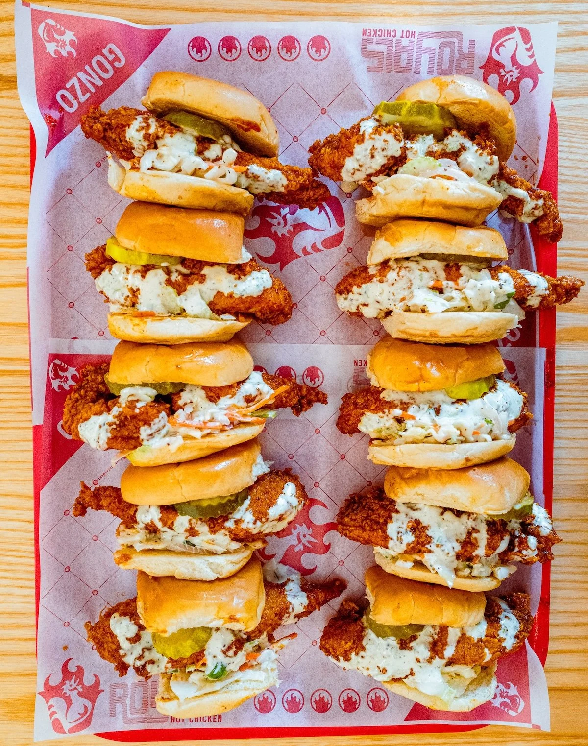 10 crispy chicken tender sliders topped with creamy coleslaw, a drizzle of Royals Ranch, and a crispy dill pickle on toasted potato slider buns. Guests can pick up to 2 heat levels to mix it up. A perfect grab-and-go option for parties, tailgates, or office lunches.